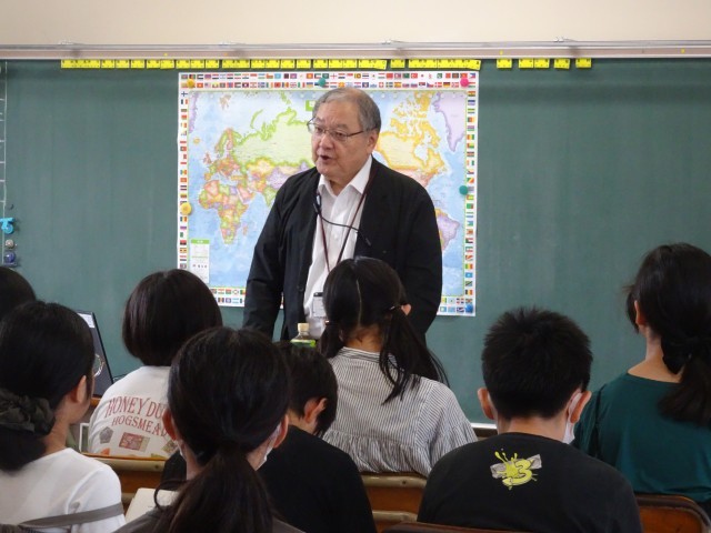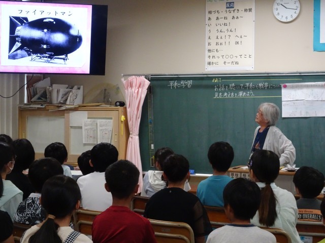 2校時に6年生の平和学習で被爆者の会の方が来られて、平和につながるお話をしていただきました。