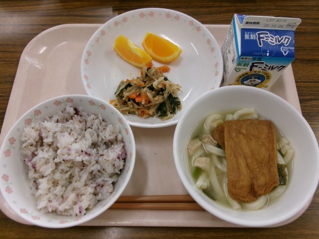 しそ麦ごはん 牛乳 丸天うどん または きつねうどん ツナともやしのごま炒め オレンジ