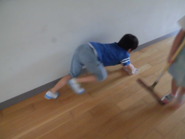 腰をかがめ、廊下を丁寧に雑巾がけする姿は、立派です。