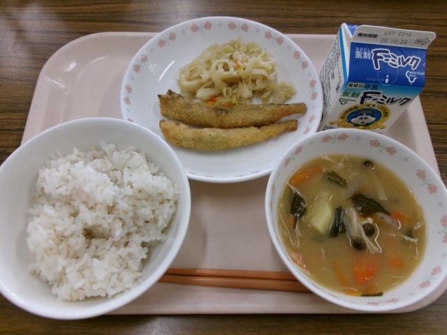 麦ごはん 牛乳 ししゃもフライ 切干大根の炒め物 きのこたっぷりみそ汁