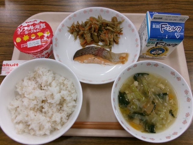 麦ごはん 牛乳 さけの塩焼き きんぴらごぼう 白菜のそぼろ汁 ヨーグルト