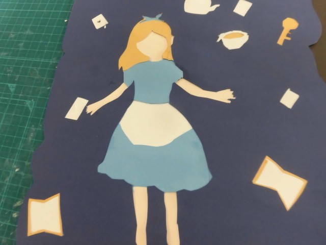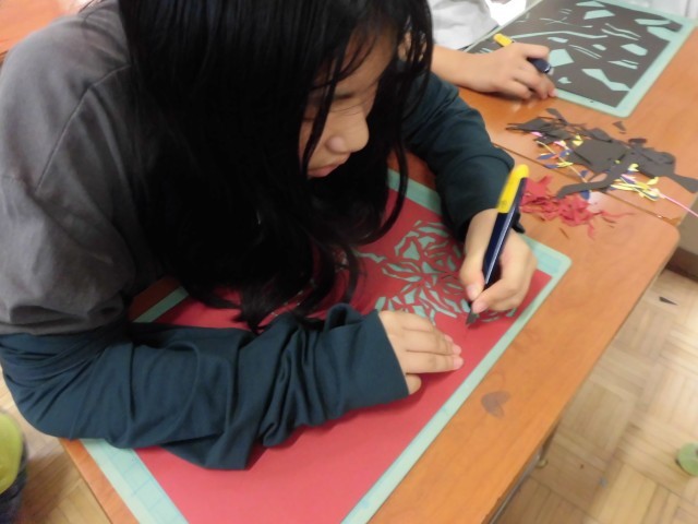 子どもたちは、何枚もの画用紙を切り抜いて、重ねて模様を作っていきます。