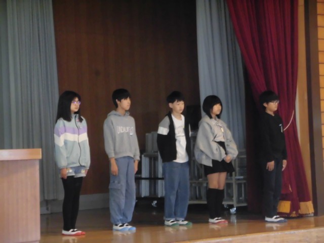 今回の全校朝会では、6年生代表児童による「修学旅行での学び」報告が行われました。