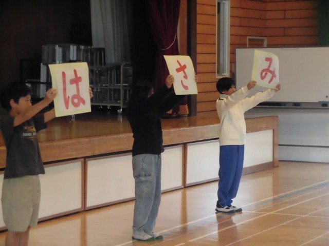 先日(11/4)、11月の全校朝会を全校児童そろって体育館で行いました。