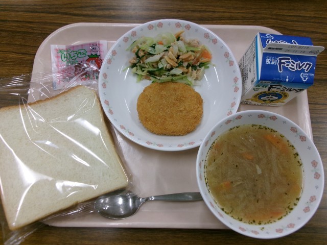 県産麦食パン 牛乳 いちごジャム 県産おからコロッケ ツナとアーモンドのサラダ オニオンスープ
