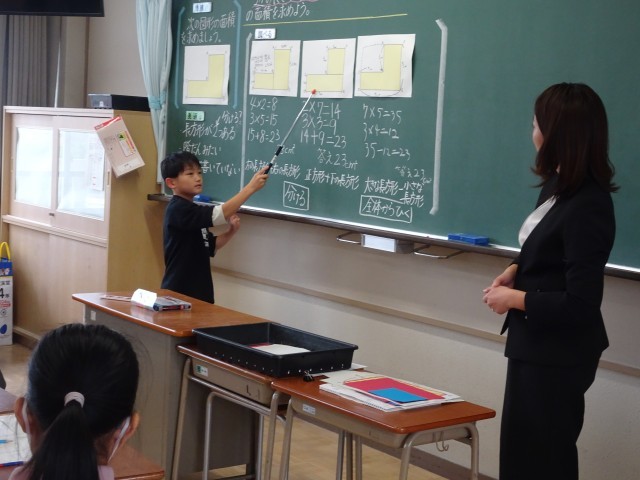 子どもたちは、長方形でも、正方形でもない図形の面積を、これまで学習してきた方法を使って考えていきます。