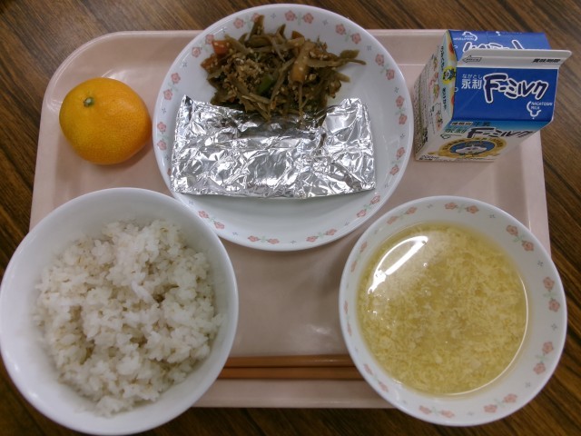 麦ごはん 牛乳 さばホイル焼き きんぴらごぼう かきたま汁 みかん