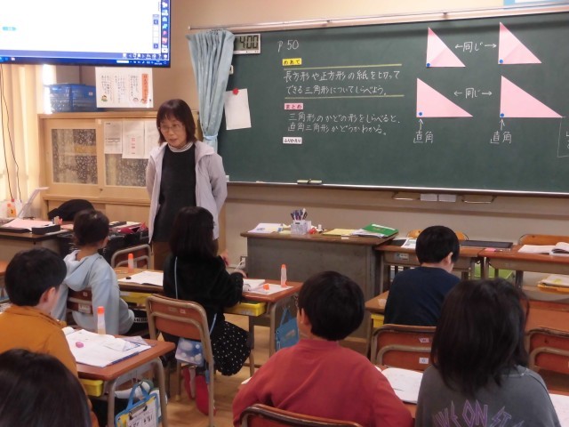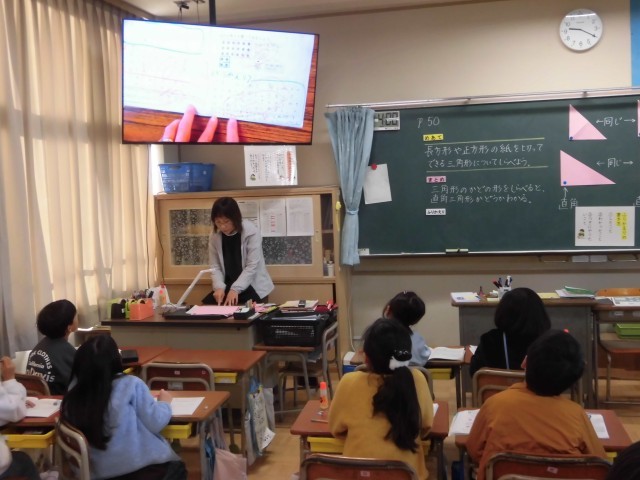 担任の濵田先生が、見本となる手本を大型提示装置に映し出して、子どもたちに指示しています。