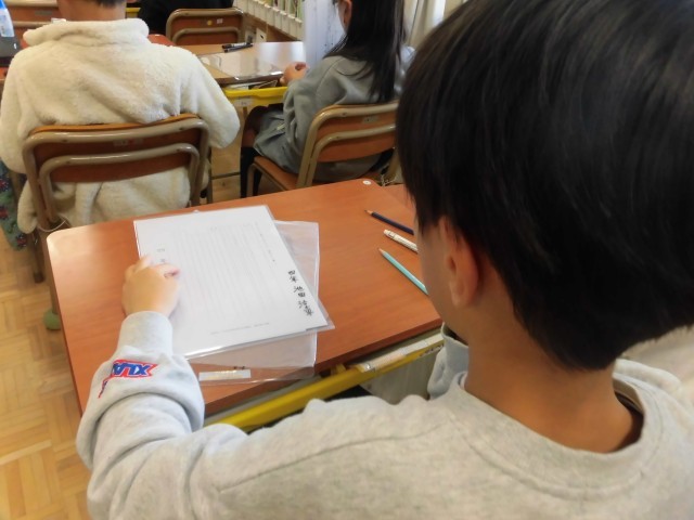 3組では、担任の藤野先生が子どもたちに手立てとして、文字がずれないように下に敷くプリントを配布して、取り組み方について説明をしていました。