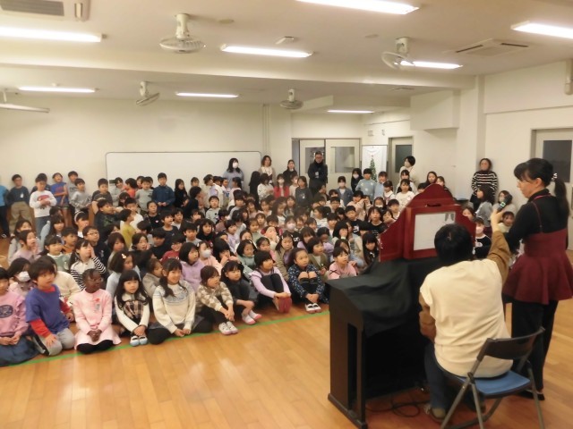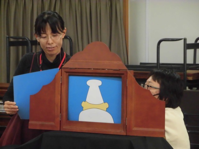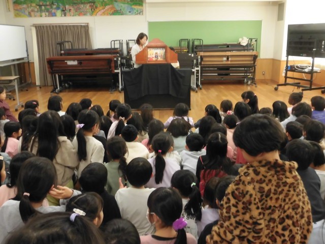 今回も、お話クラブの方がめくる紙芝居方式のお話に、子どもたちは食い入るように見つめていました。