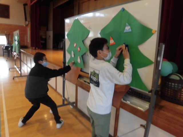 プログラムは、「流行語クイズ」「クリスマスツリー飾りつけ競争」「各学年の思いで劇」「ソーラン節」です。