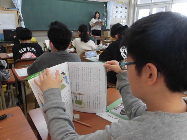 価値の方向付けを行った後、教材文「家族の一員として」を担任が範読しています。