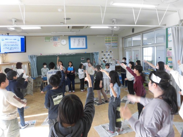 5年5組では、クリスマス集会で新聞紙ゲームをしていました。