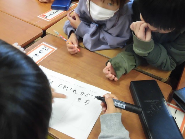 子どもたちは頭を寄せ合い、回答用紙に文字を書いていきます。