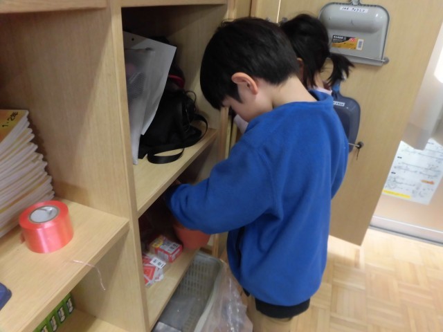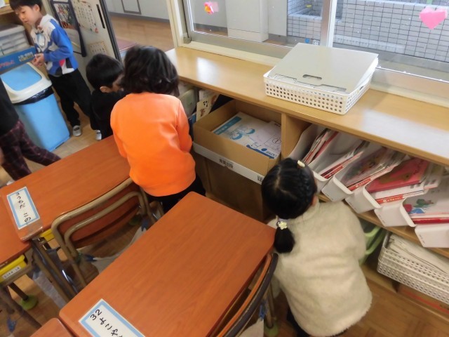 教室のどこかに隠された「アタリ」とかかれた折り紙を探します。