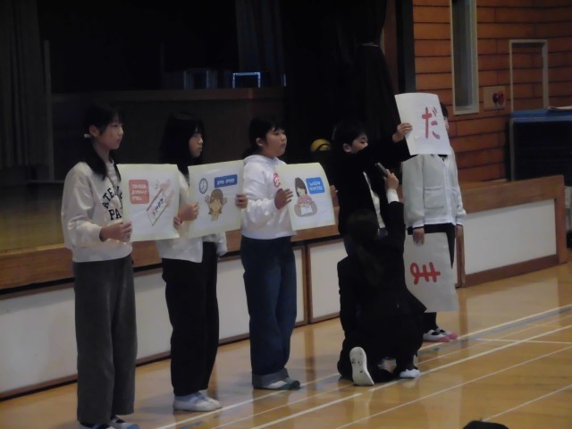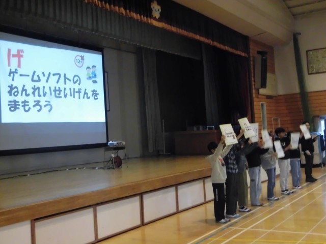 その後、冬休みの約束をキーワード「お・と・し・だ・ま」の5文字で子どもたちが紹介しました。