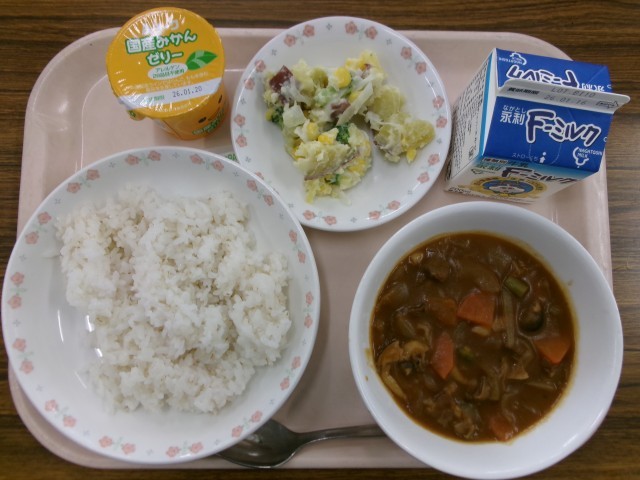 ハヤシライス(麦ごはん) 牛乳 さつまいものサラダ みかんゼリー