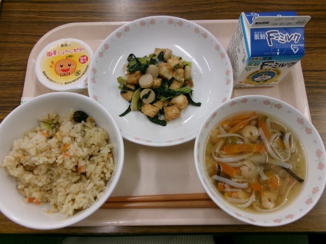 ツナともずくの炊き込みごはん 牛乳 厚揚げの炒め物 汁ビーフン いよかんゼリー