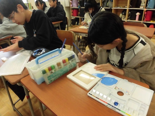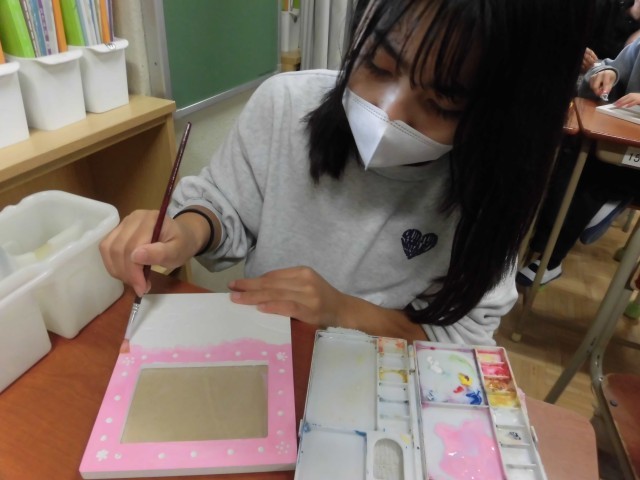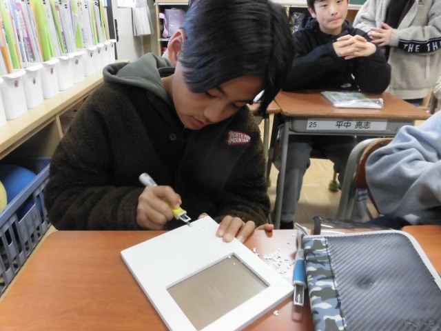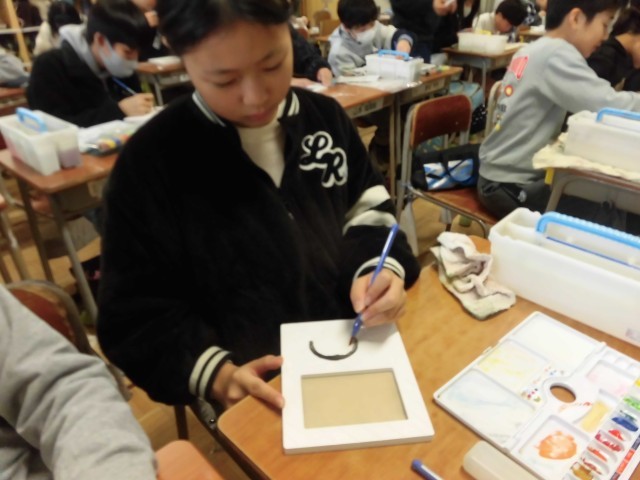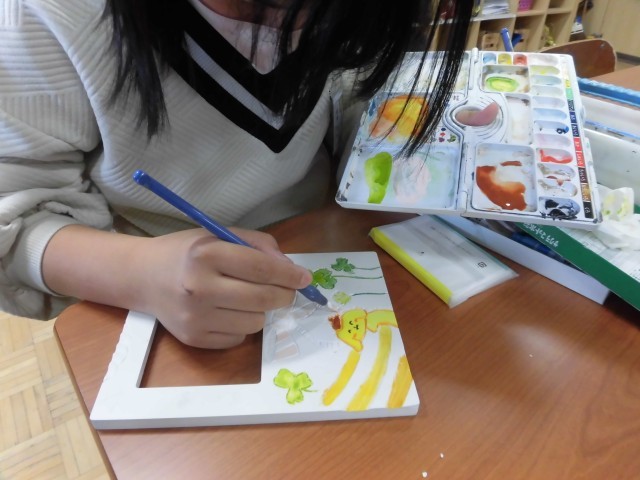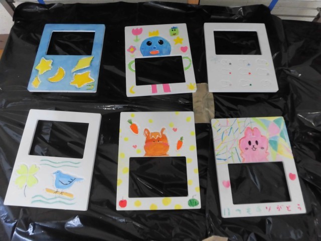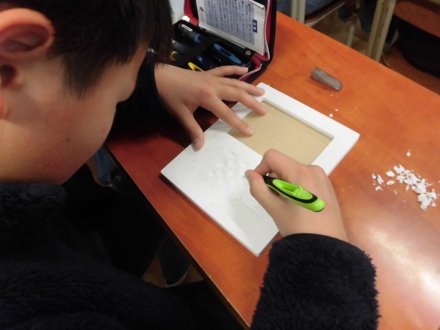 子どもたちは、真っ白なフレームに思い思いの絵を描き、彫刻等を使って彫って、色を塗っていきました。