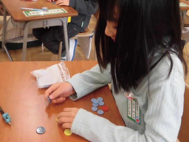 子どもたちはお金を机の上に並べて、「あ~でもない、こ~でもない」と言いながら、課題を解決していきました。