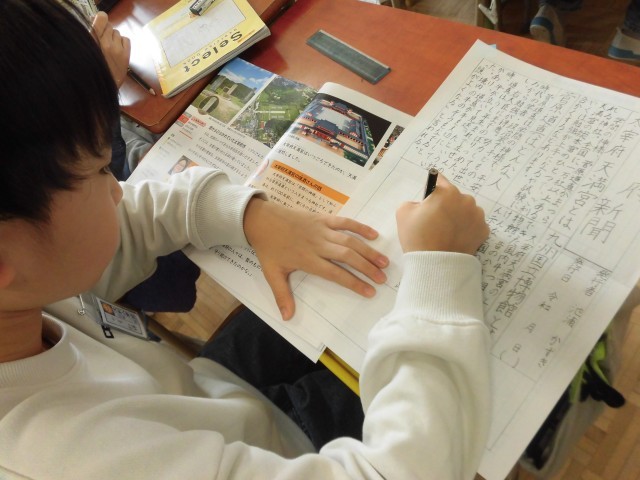 自分たちで実際に見てきた史跡や博物館の展示物などを参考にしながら、自分なりに太宰府のまちづくりに対する自分なりの考えをまとめていました。