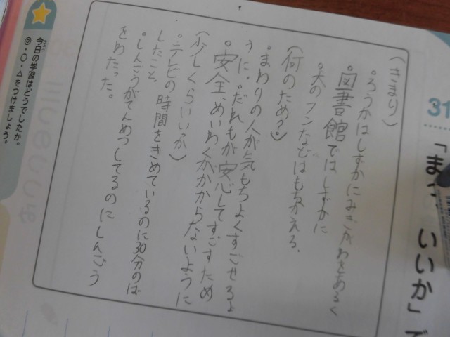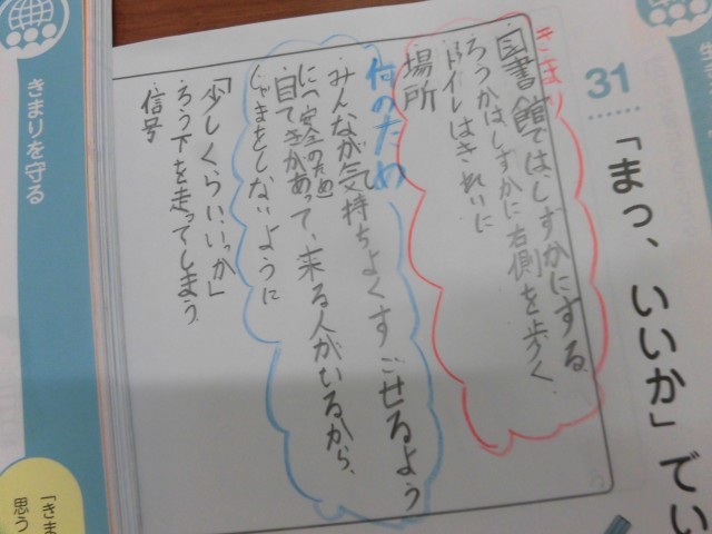 子どもたちは身の回りの決まりについて、自分の生活を振り返っていきました。