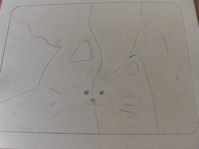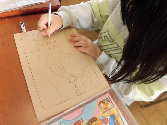 大きく6~8つに切り分けられた板の形から子どもたちはイメージを膨らませて、「山」「海」「動物」「スポーツ」などの絵を描きこんでいきました。