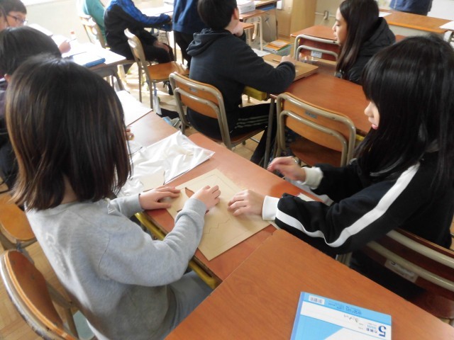 この学習の中で、子どもたちは様々な形に切られた板の形に合わせて模様を描いていました。