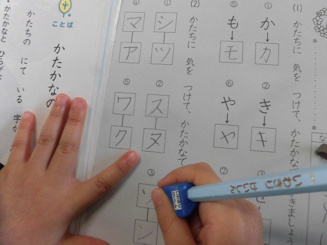1年生の国語科では「かたかなの かたち」を学習しています。