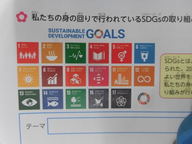 3組では、内田先生の指導のもと、よりよい地球環境をつくるために定められたSDGsの17の目標のうち、自分で目標設定し、身の回りで行われている取組について調べ学習を行っています。