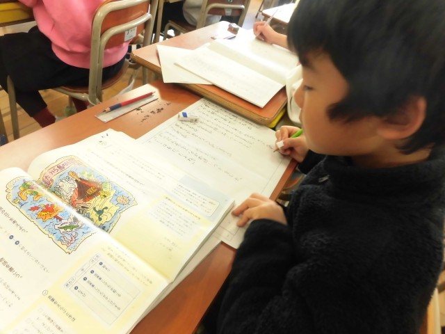 鉛筆がなかなか進まない子もいますが、中にはスイスイ進めて、なんと7枚目を書き始める子もいました。