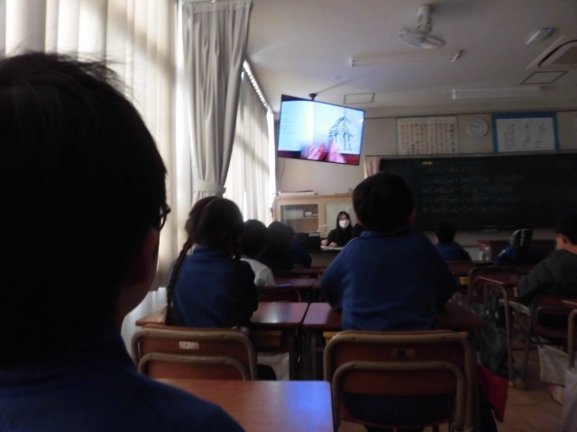 教室を少し暗くして、大型提示装置に絵本を映し出しています。