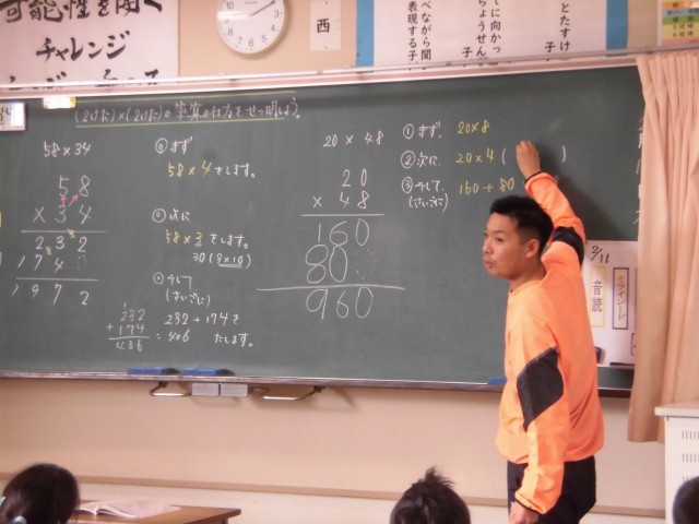 4組では担任の白水先生が、「2けた×2けた」の計算を意図的に間違えて提示し、その間違いの理由を子どもたちに尋ねていました。
