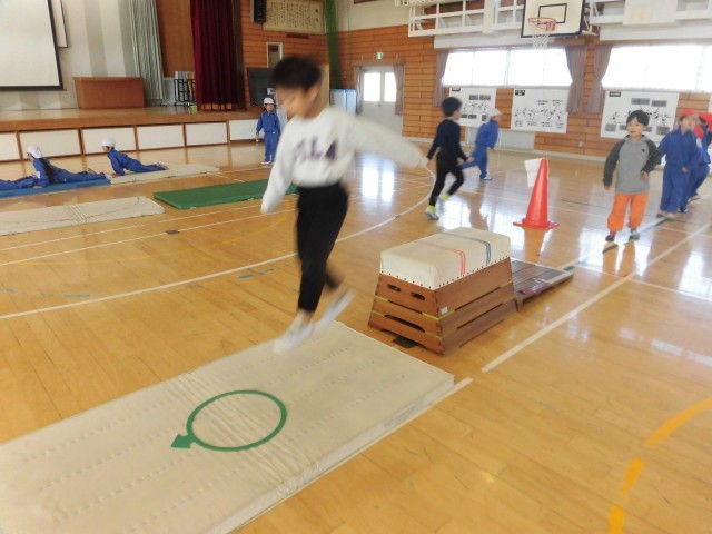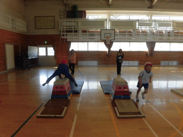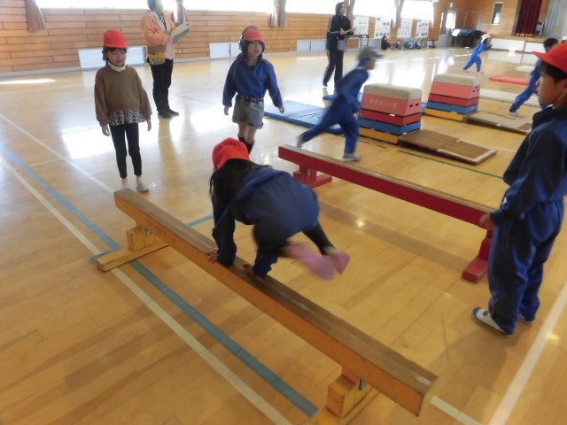 平均台や跳び箱、マットを使い、工夫した場の設定で子どもたちは、それぞれ自分に合った運動を選択しているようでした。