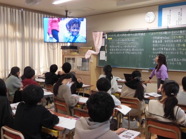 今回は、大型モニターを活用して、Unicef(ユニセフ)の活動を学びました。