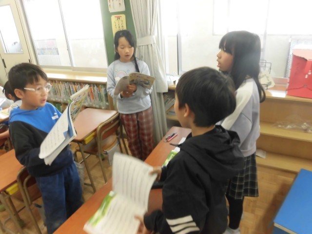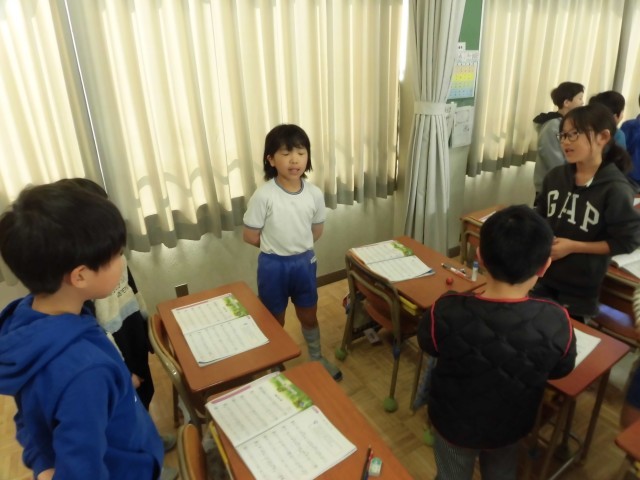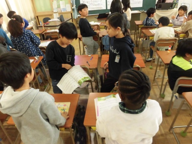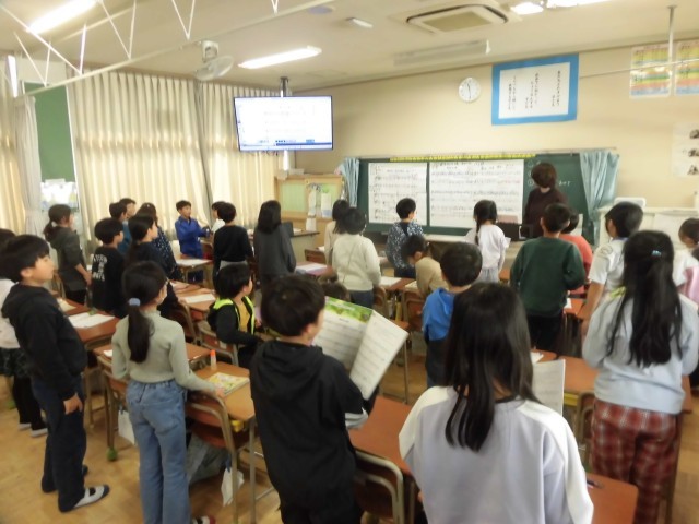 担任の津原先生が①リズム②音程③局長に合わせて、の3つのポイントを説明して、グループで歌う練習をさせていました。