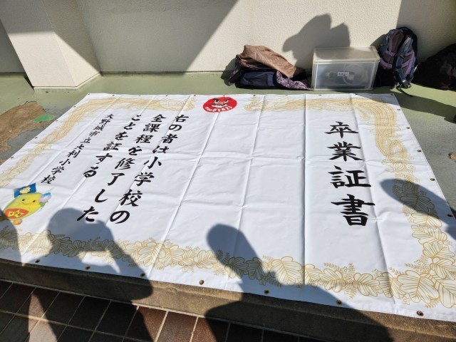 今年度、おやじから学校への贈り物として「等身大の卒業証書パネル」を作っていただきました(写真掲載あり)。卒業式当日、子ども達の晴れやかな姿をぜひパチリと♪