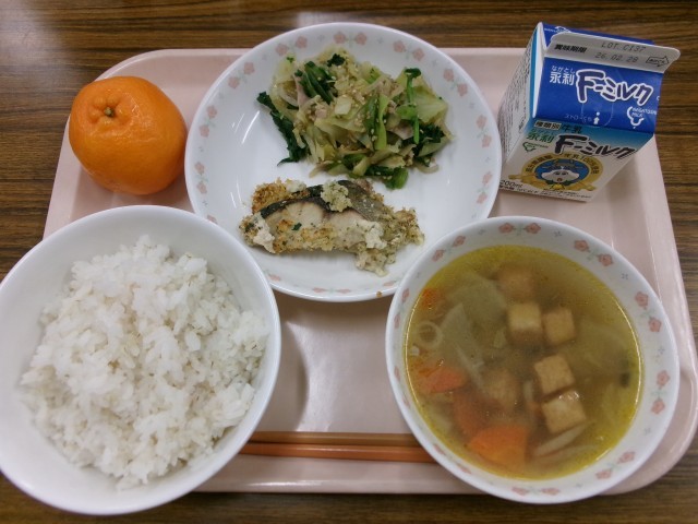 麦ごはん 牛乳 あじのパン粉焼き 春菊のごま和え 鶏ごぼう汁 ぽんかん
