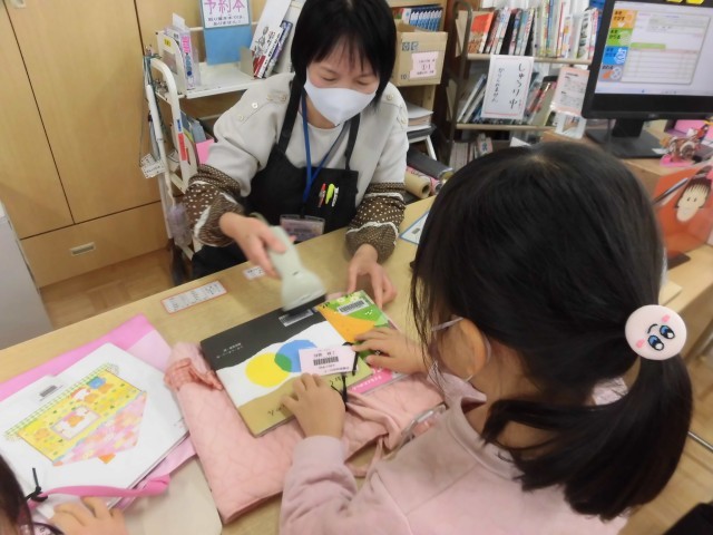 1年生が図書室で本を借りています。