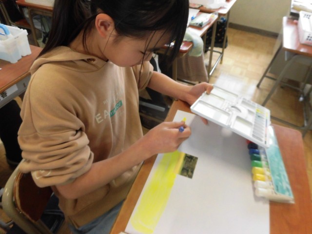 子どもたちは、写真を貼る場所も工夫しながら、構図を決め、色を塗っていきました。