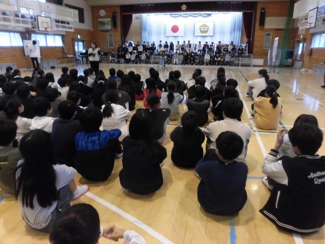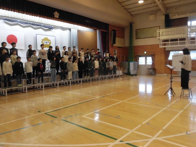 今朝(3/6)、5年生有志が2/7(土)に青少年のための音楽会で発表した歌声を、5年生に披露しました。