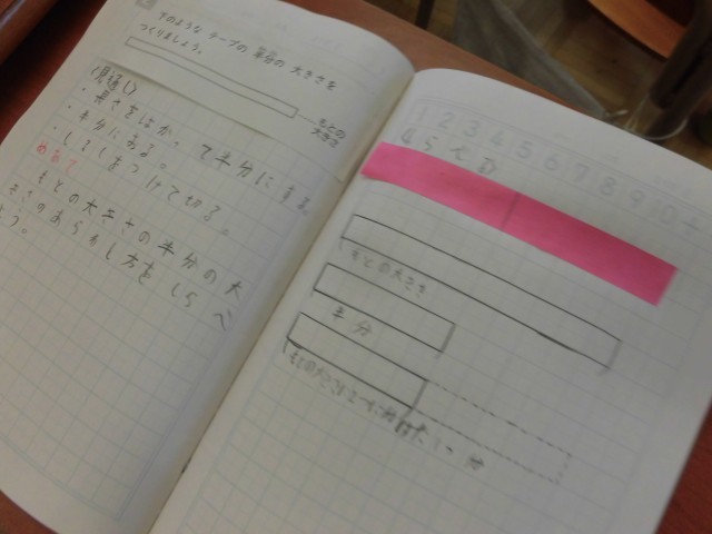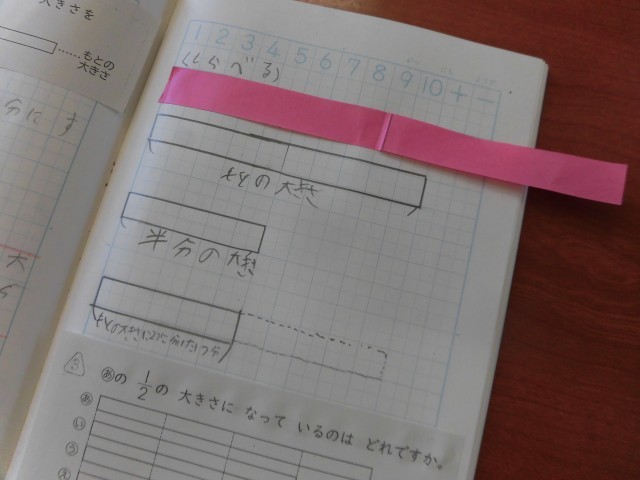 学習ノートには、短冊状に切られた折り紙を使って、半分に折りたたむ活動を通して、「もとの大きさの半分の表し方」を学びました。