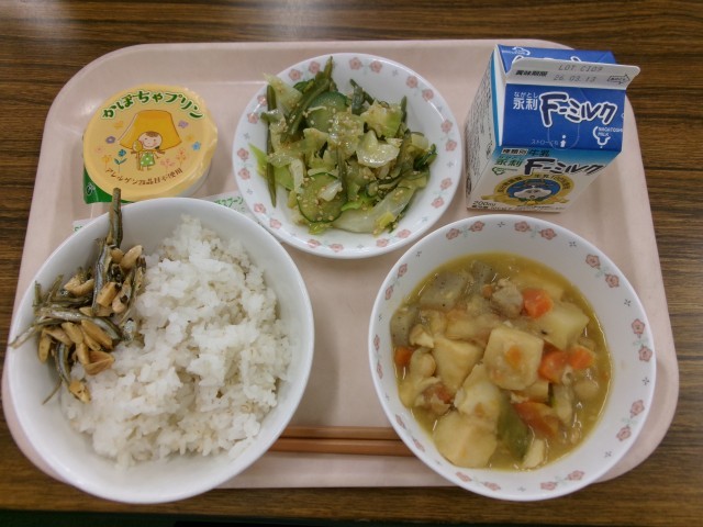 麦ごはん 牛乳 厚揚げと野菜のうま煮 茎わかめのサラダ アーモンドいりこ かぼちゃプリン