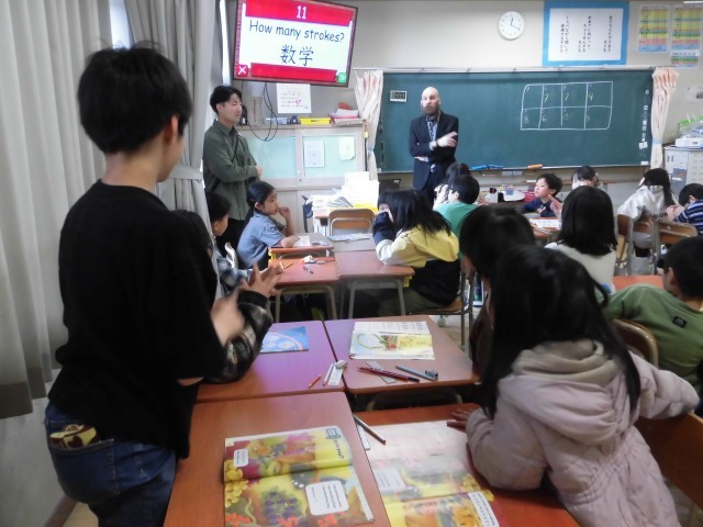 子どもたちは、ALTのニック先生と一緒に、楽しくゲームをしていました。