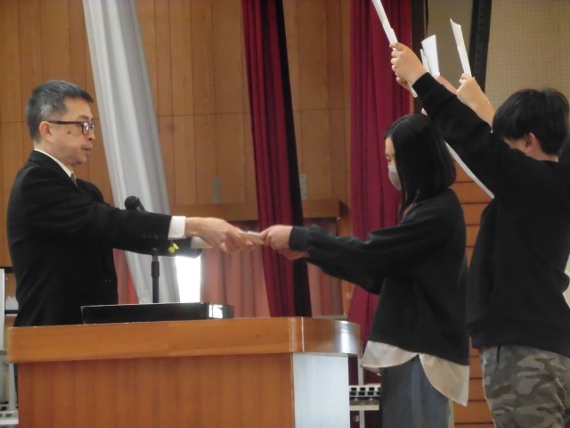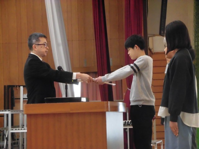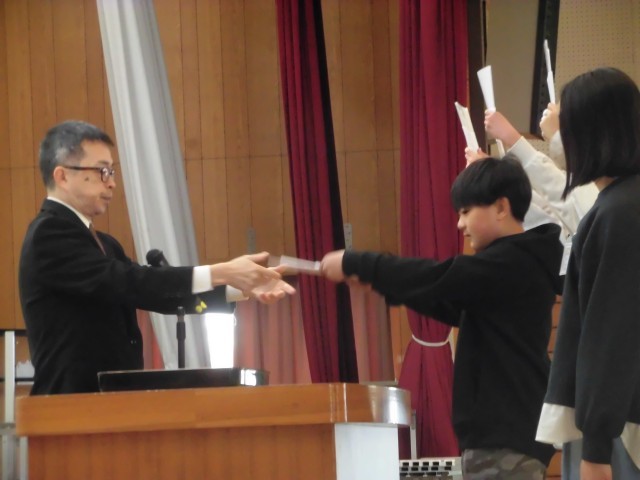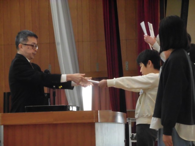 子どもたちは、各クラス代表児童1名ずつが壇上にあがり、校長より「修了証」を受け取りました。
