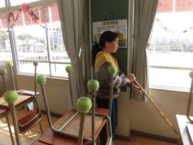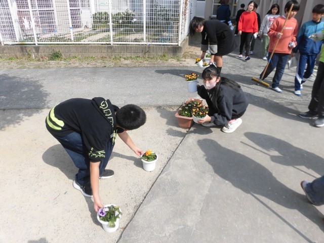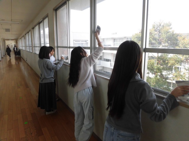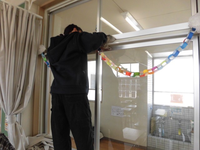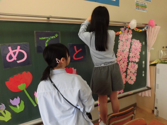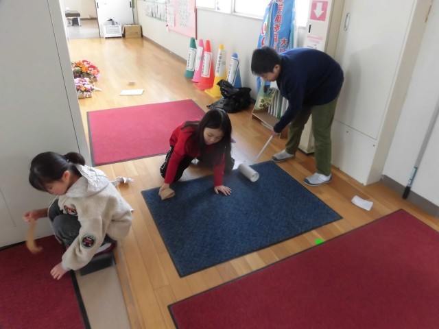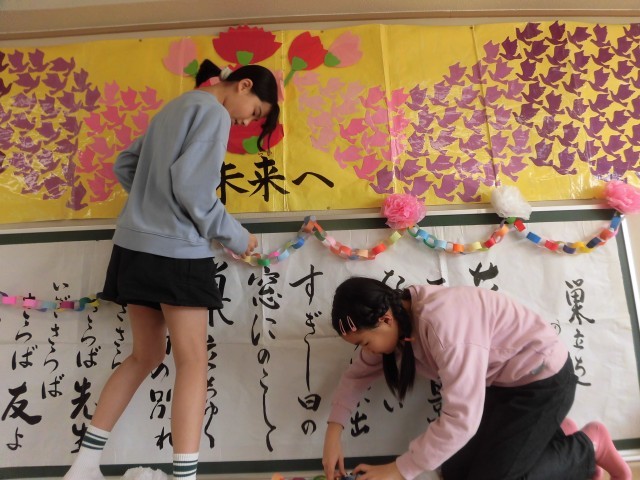 会場となる体育館や教室だけでなく、廊下や窓、卒業生が歩くであろう通路、手洗い場、マットなどを設営したり、掃除したり、飾りつけしたりしました。
