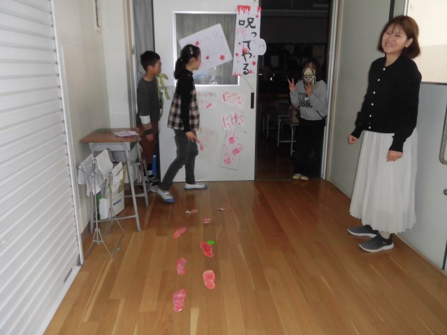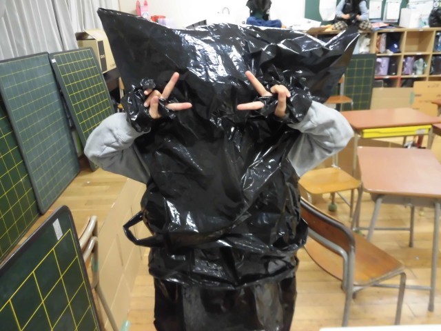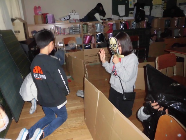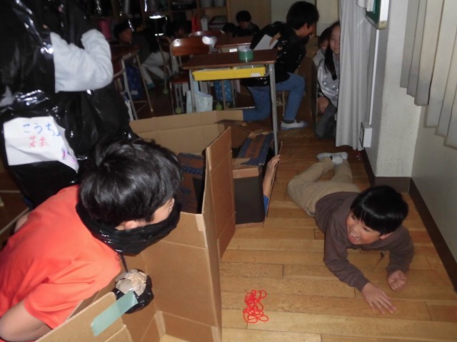 教室の中をのぞくと、うすぐら~い中に、恐怖のお面や真っ黒なビニールをかぶった「おばけ」が何人もいました。
