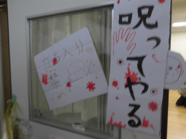 のぞいてみると、教室の扉には「立ち入り禁止…」「〇ってやる…」と怖い言葉が…