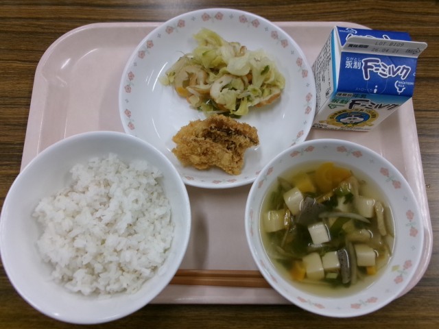 麦ごはん 牛乳 めばるフライ 野菜炒め けんちん汁