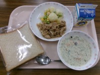 減塩食パン 牛乳 さつまいものスペイン風オムレツ ツナサラダ パンプキンスープ だいだいのババロア